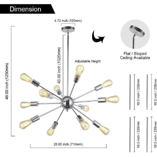 This sputnik chandelier with a durable swivel could be mounted on vaulted or angled ceilings.12 lights sputnik art design, all arms evenly arranged around the geometric line symmetry, combined with modern aesthetic and romantic elements, providing your home more fashion and mystery atmosphere.